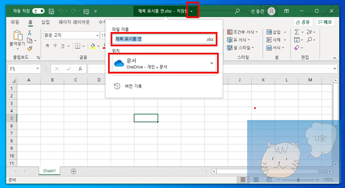 오피스365 엑셀화면에서 제목 표시줄은 현재 열려 있는 파일 이름과, 파일의 위치, 버전 기록을 알 수 있습니다. 엑셀을 실행하면 원하는 위치에 저장해 두는 것이 좋습니다. 간단하면서 중요한 개념이기 때문에 잘 알아두는 것이 좋습니다.