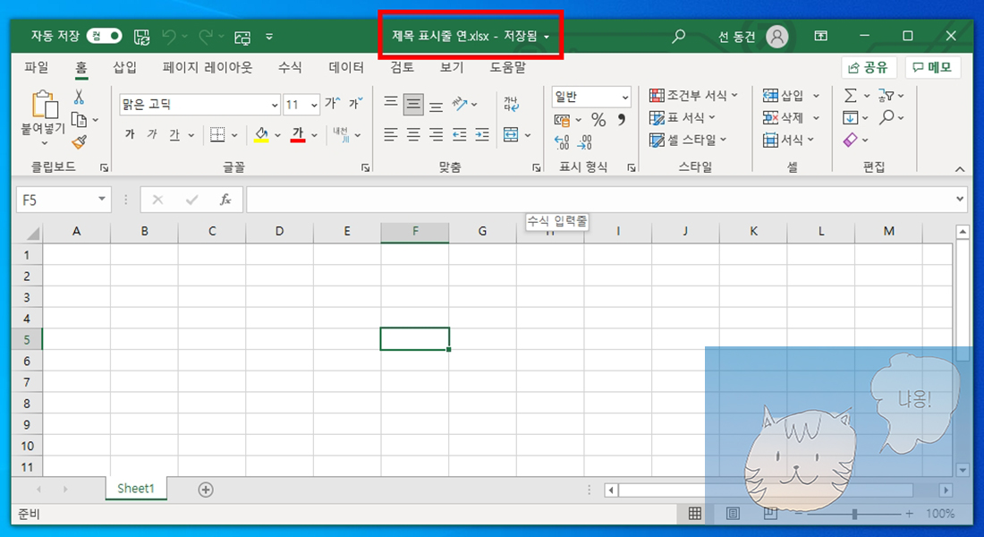 위의 사진과 같이 제목 표시줄에 변경된 파일 이름이 표시되어 있습니다. 저는 파일을 저장할때 제목 표시줄 연습이라고 입력하였기에 옳바르게 표시되어 있는 것을 알 수 있습니다. 그리고 제목 표시줄 이름 옆에 저장됨이라고 표시되어 있습니다.