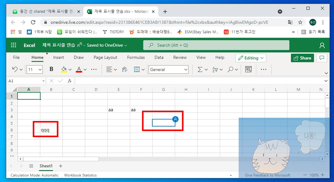 제목 표시줄 연습. xlsx파일이 마치 인터넷 브라우저처럼 뜬 것을 알 수 있습니다. 여기서 B6셀에 원하는 값을 입력해 봅니다. 저는 qqq를 입력하였습니다. G5셀는 다른 사용자가 사용하고 있다는 의미입니다.