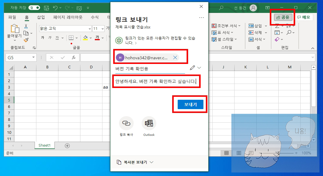파일을 공유하는 방법은 여러가지가 있지만 여기서는 버전 기록을 살펴보기 위해 다른 사용자에게 현재 파일을 메일로 보내보겠습니다. 맨 우측의 공유 버튼을 클릭하면 창이 하나 뜨게 됩니다. 메일을 입력하고 간단한 메모를 적습니다. 저는 저의 메일 hohova342@naver.com을 입력하였고 메모에 안녕하세요. 버전 기록을 확인하고 싶습니다.를 입력하였습니다. 입력을 완료하였다면 보내기를 클릭합니다.