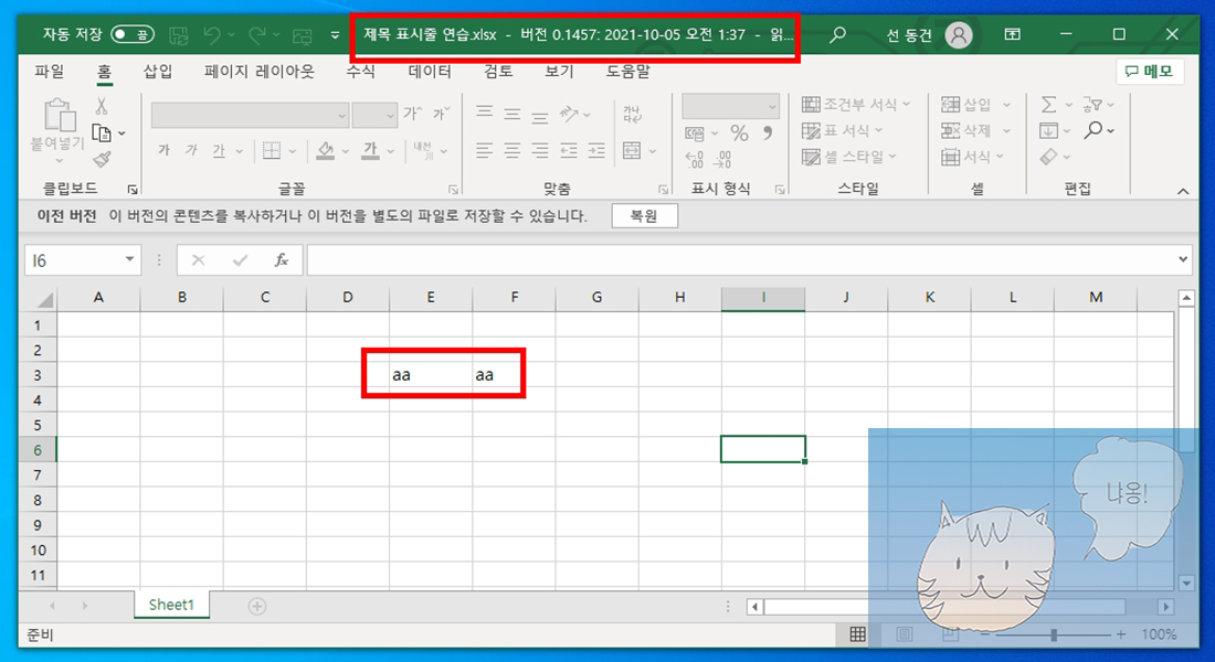 새창이 뜨면서 실행한 엑셀 파일이 열립니다. 제목 표시줄에 버전 정보와 날짜가 표시되며 해당 날짜에 어떤 작업을 했는지 나타납니다. 즉, 셀에 E3셀과 F3셀에 aa를 입력했던 것을 알 수 있습니다. 끝